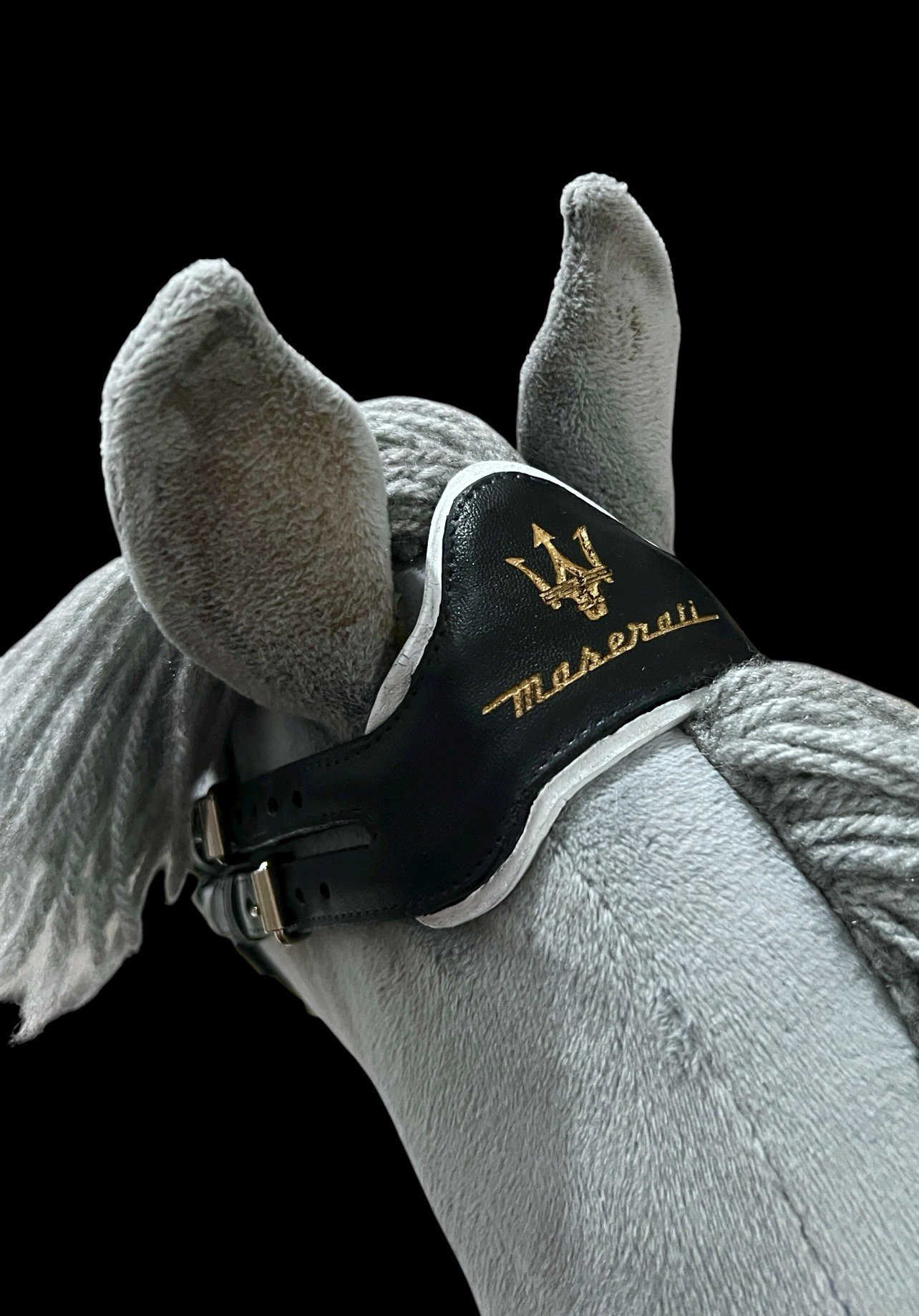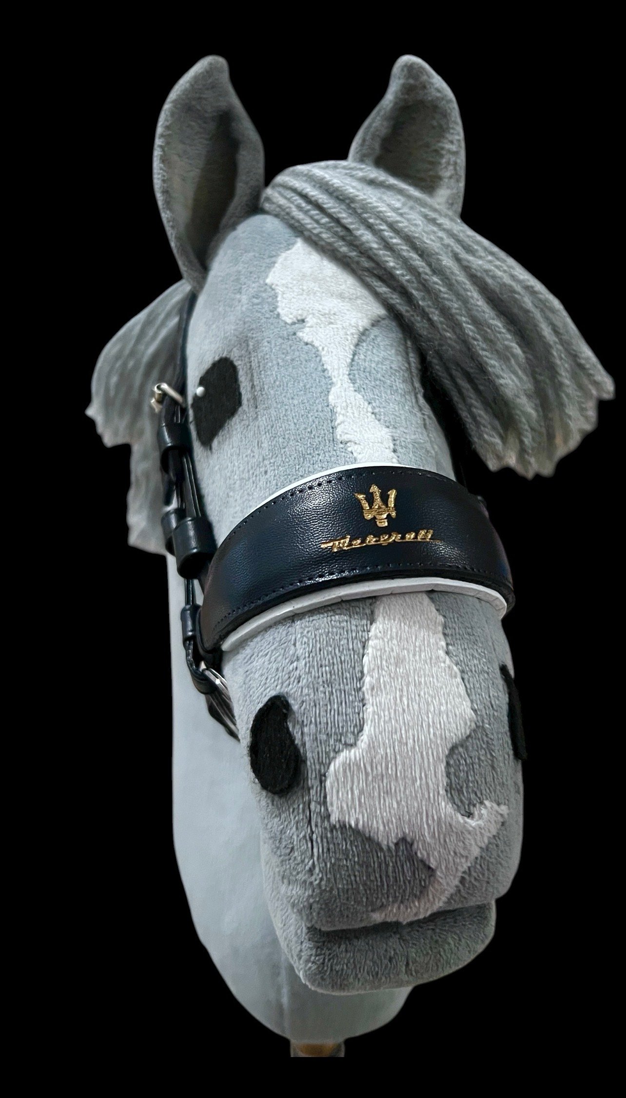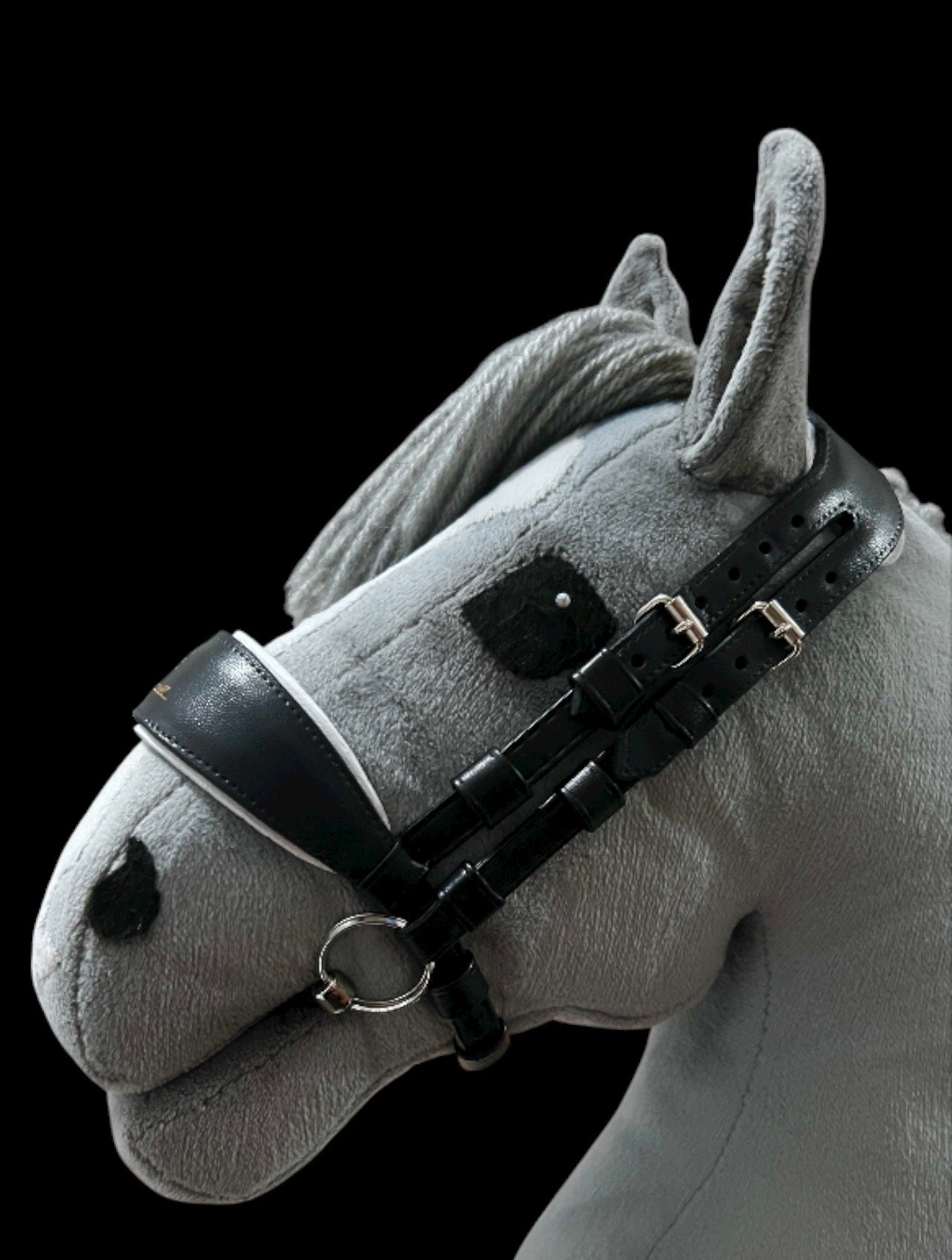 Superschöne, handgefertigte, englische Hobbyhorse Trense aus schwarzem Kunstleder. Unbespieltes Einzelstück. Passend für A4 Horsis und mit den fünf beiliegenden Riemenverlängerungen auch für größere A3 Horsis. Kurz gesagt, es passt Hymy, Kami und ganz klein eingestellt auch einem Cennet Fohlen. Gelasertes und handbemaltes Logo auf Nasenpolster und dem anatomischen Nackenteil.