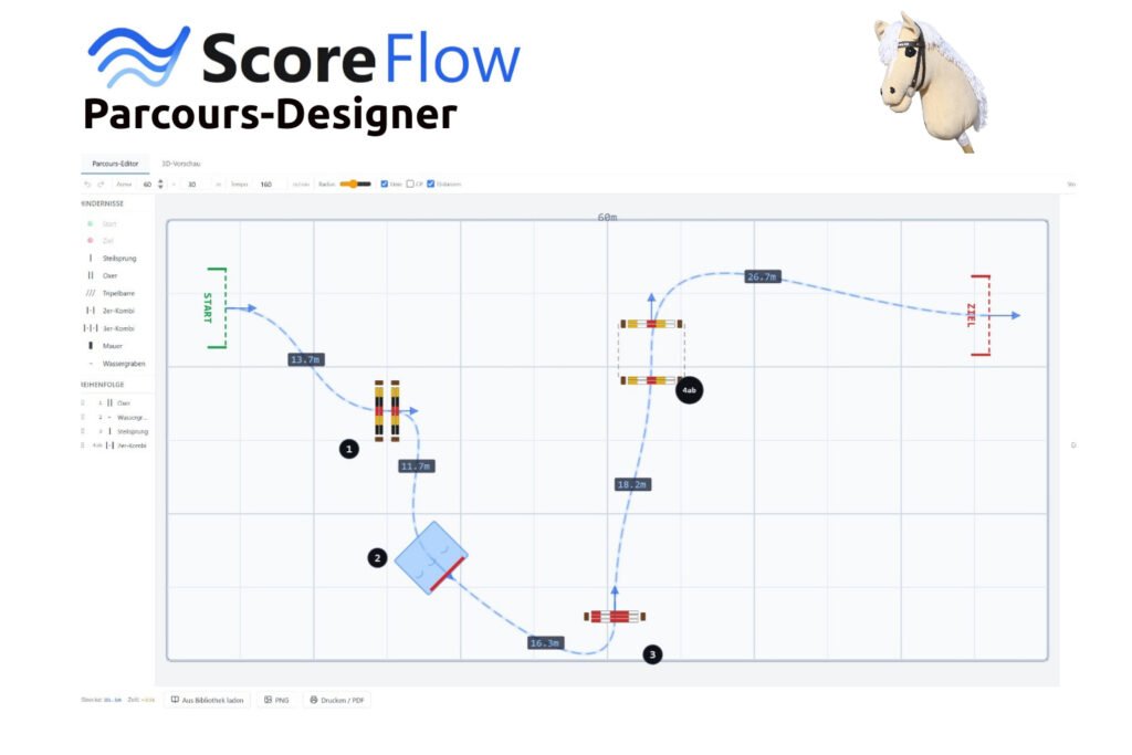 Neben den klassischen Funktionen einer Turnierverwaltungssoftware bietet ScoreFlow zusätzlich einen innovativen Parcours-Designer.